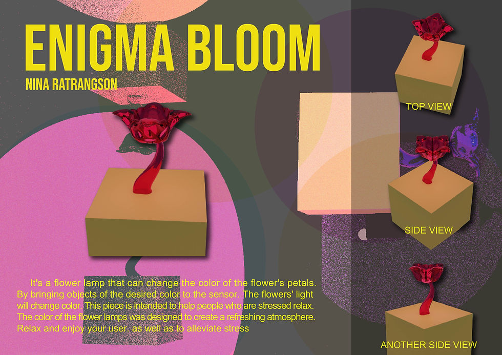 It’s the flower lamp that can change the color of the flower’s petals by bringing objects of the desired color to the sensor then the flower’s light will change color. This piece is intended to help people who got stressed to be relax. The color of the flower lamps was designed to create a refreshing atmosphere , relax and enjoy to user. As well as to alleviate stress.